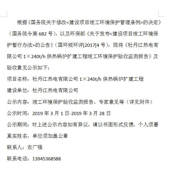 牡丹江熱電有限公司1×240t/h供熱鍋爐擴建工程項目竣工環(huán)境保護(hù)驗收監(jiān)測公示